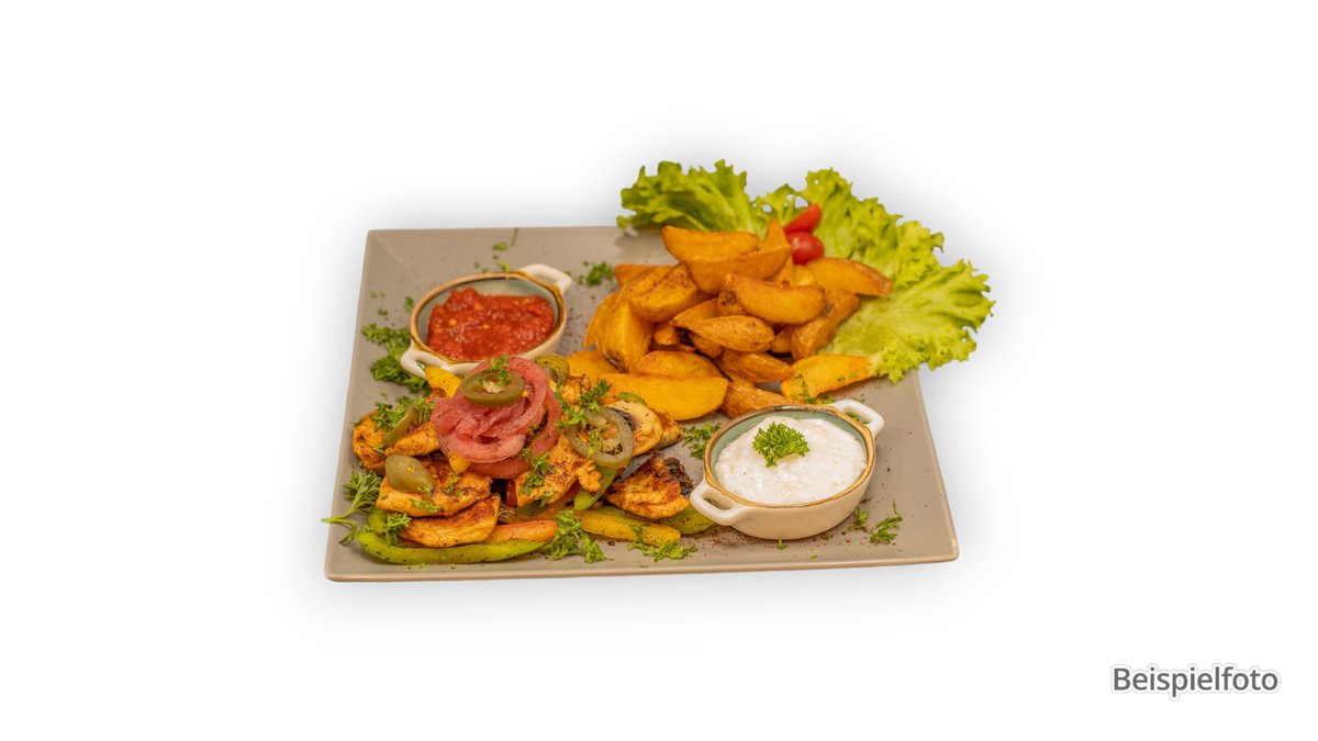Hähnchenspieß mit Pommes, Knoblauchsauce und Salat