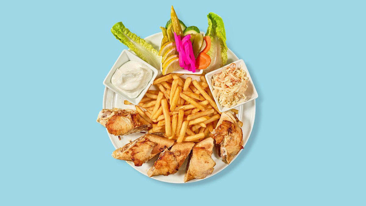 Ganzes paniertes Hähnchen mit Pommes frites, Knoblauchsoße, Salzgurke und Salat