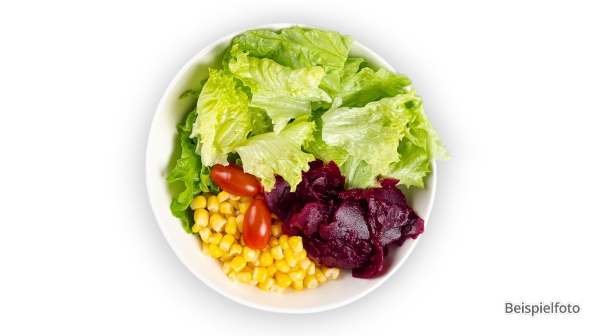 gemischter Salat mit Tomaten, Gurken, Mais, Zwiebeln, Putenstreifen und Oliven