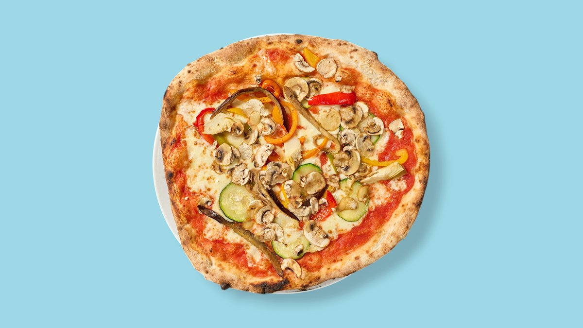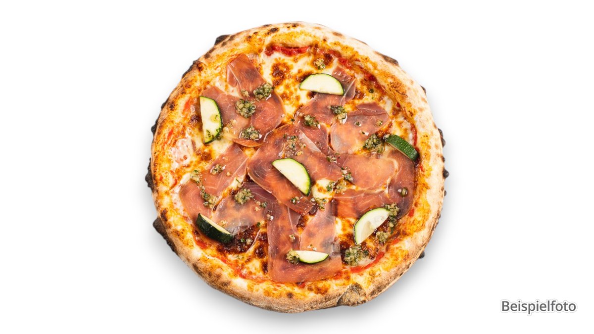 mit Champignons, Zucchini, Auberginen, Parmaschinken und Oliven