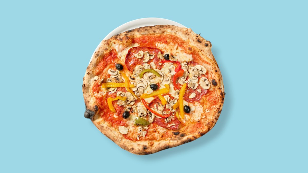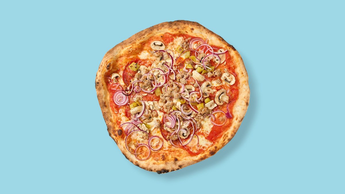 mit Spianata Calabrese (scharfe Salami vom Schwein), Peperoni, Champignons, Salsiccia vom Schwein und Zwiebeln