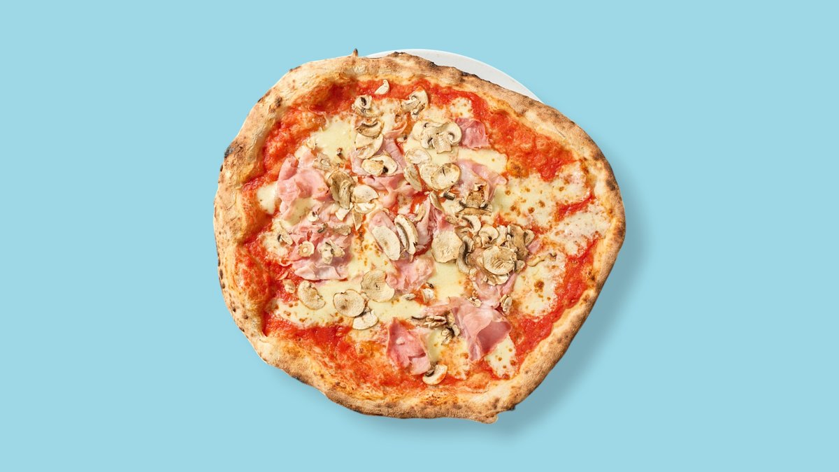 gefüllte Pizza mit Tomatensoße, Mozzarella, Salami vom Schwein, Kochschinken vom Schwein und Champignons