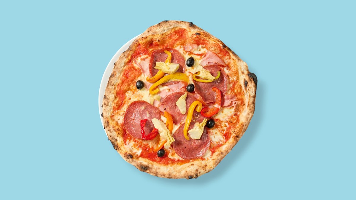 mit Kochschinken vom Schwein, Salami vom Schwein, Artischocken, Paprika und Oliven