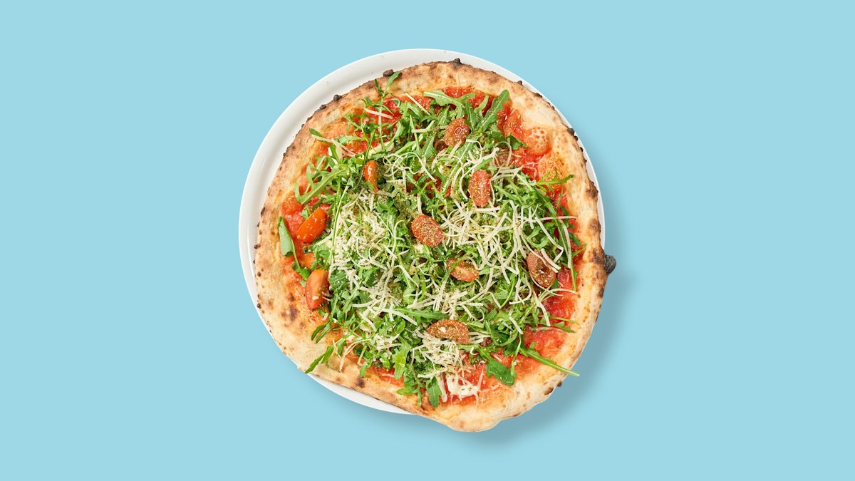 mit Zucchini, Speck vom Schwein, Kirschtomaten, Ei und Rucola
