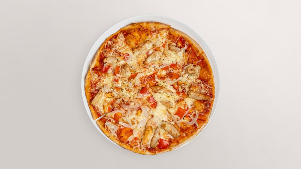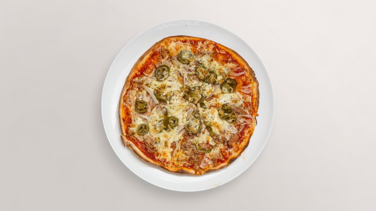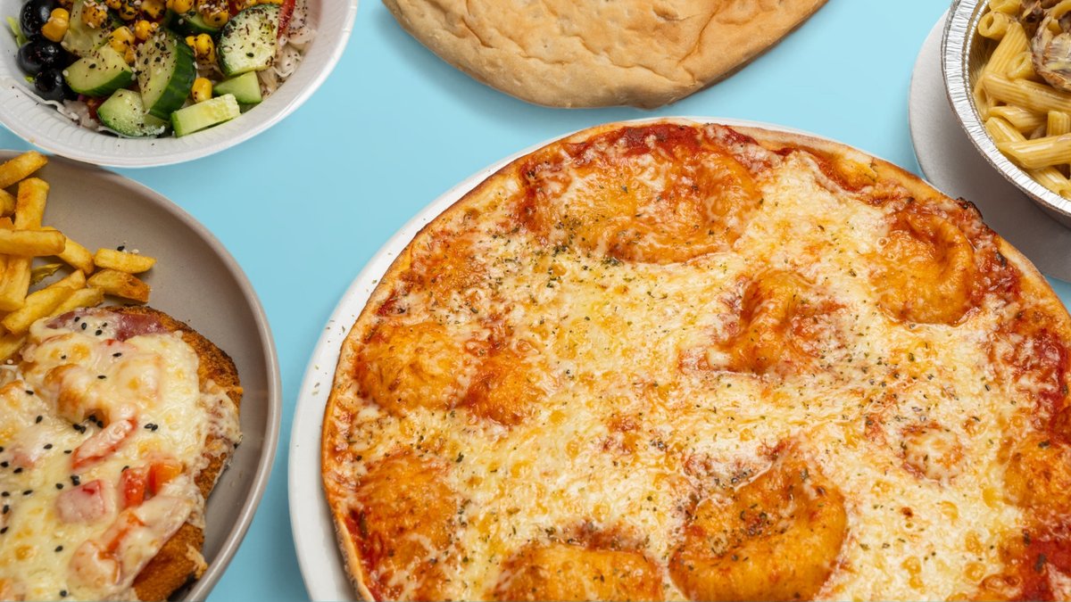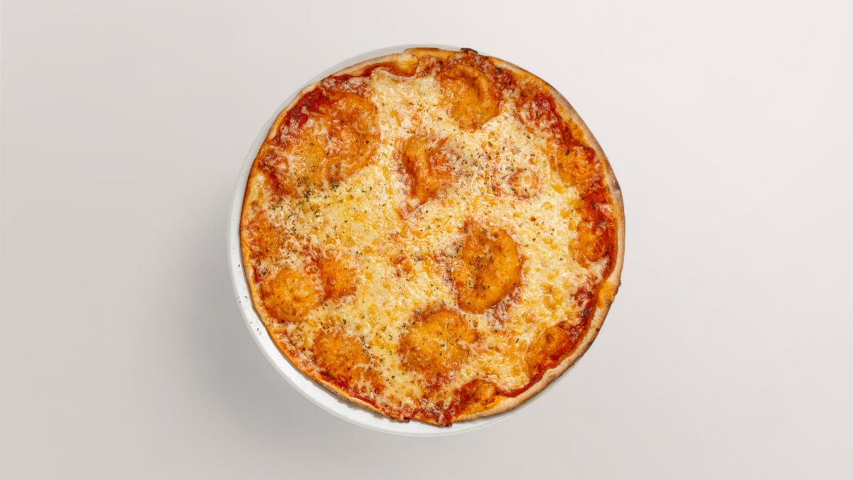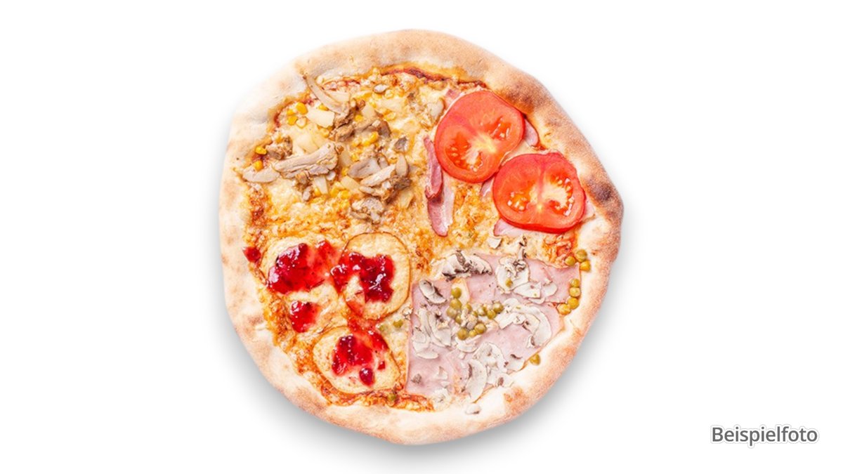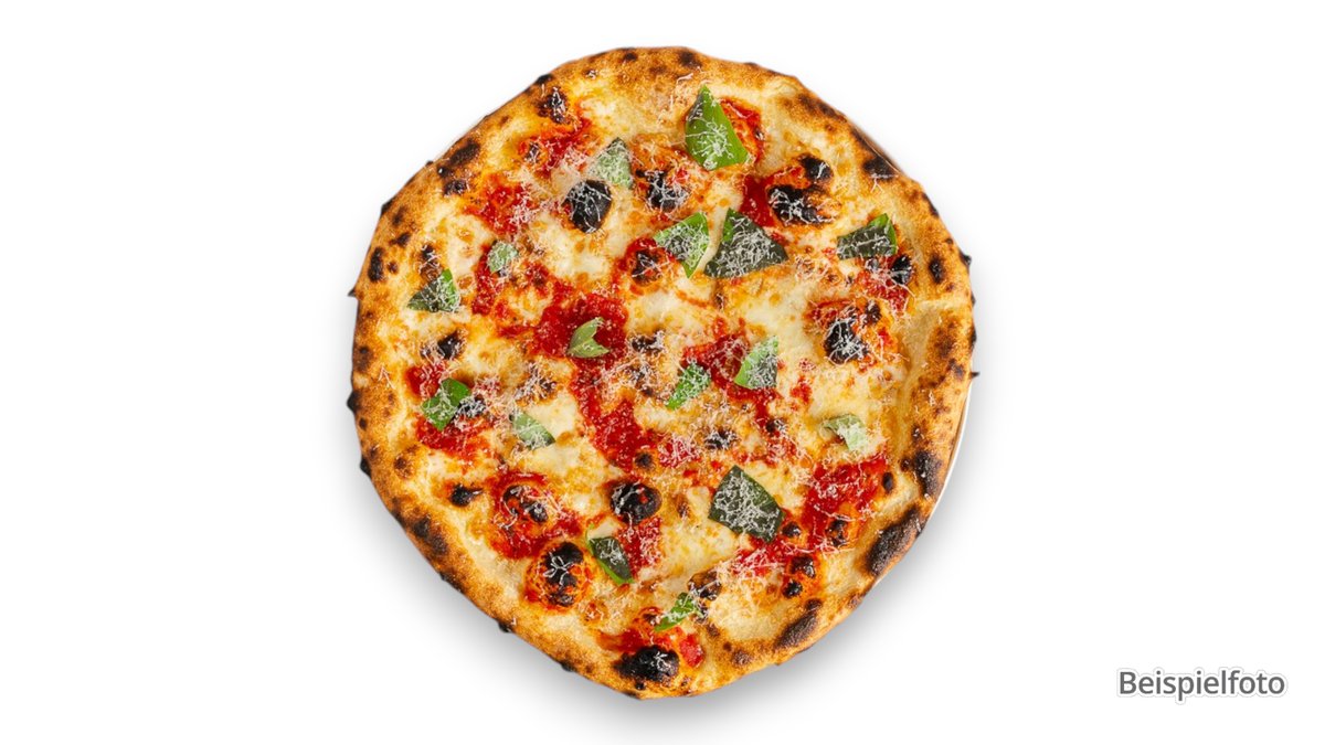 alle Pizzen werden in einer Größe deiner Wahl serviert und mit Tomatensoße und Käse zubereitet