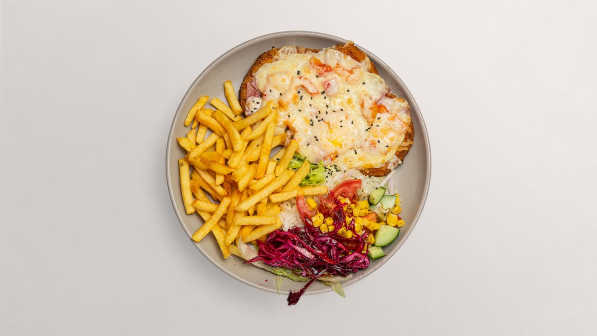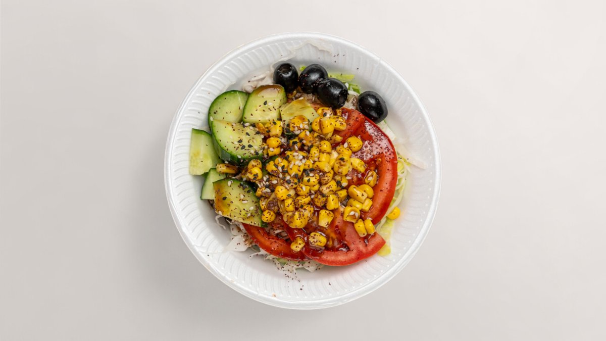 alle Gerichte werden mit Eisbergsalat, Tomaten, Gurken, Mais, Paprika und einem Dressing deiner Wahl zubereitet und in einer Größe deiner Wahl serviert