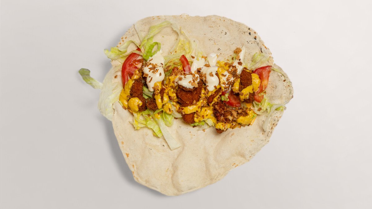 mit Drehspieß von Kalbfleisch in Fladenbrot, Salat und Soße