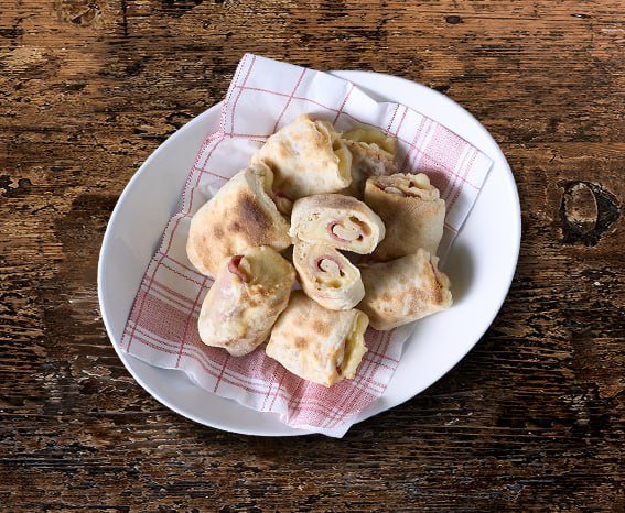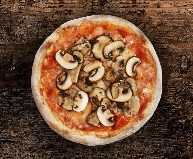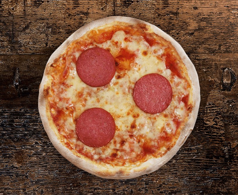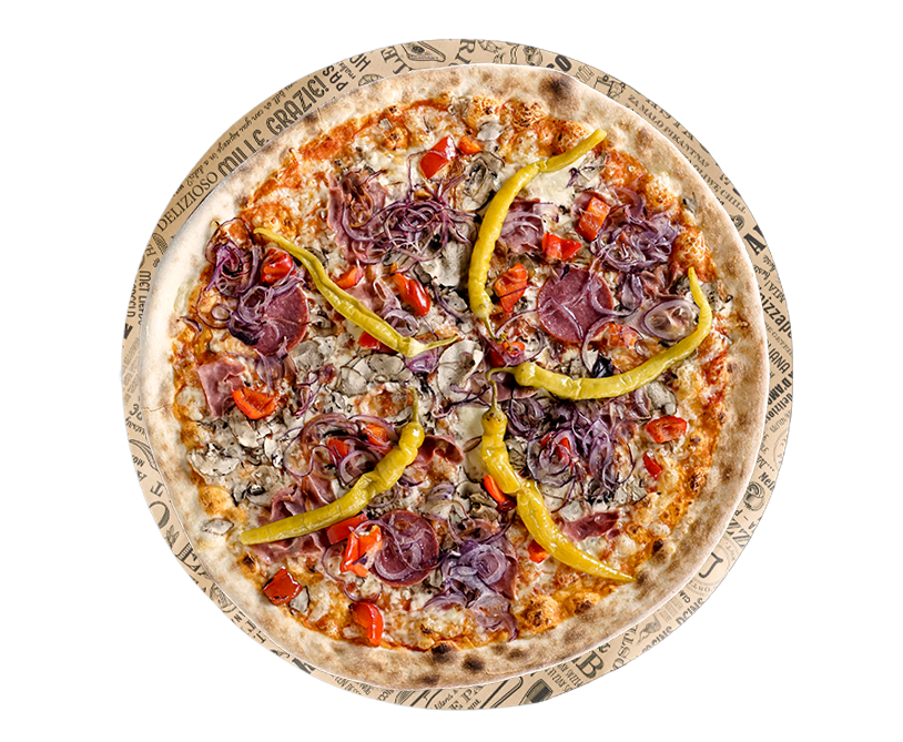 Käse, Hinterschinken, frische Champignons, Salami, Paprika, Peperoni, Zwiebeln