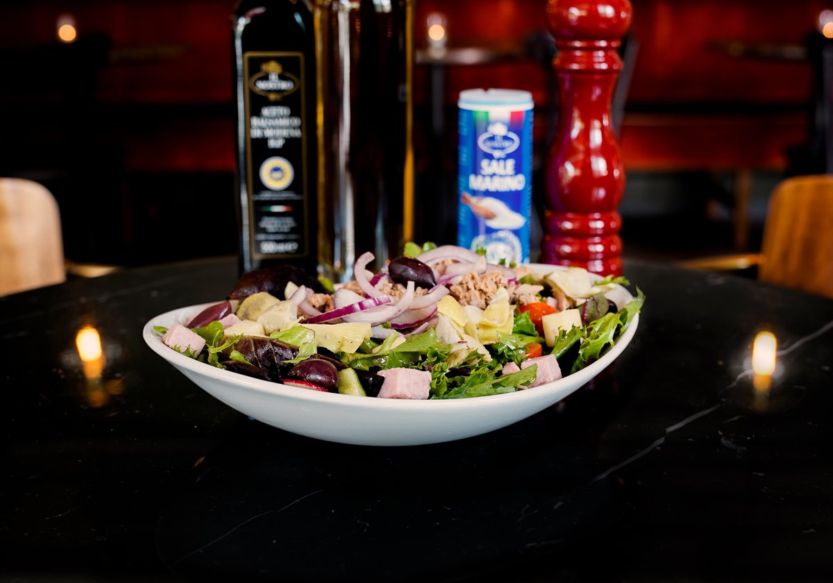 gemischter Baby-Leaf-Salat, Kirschtomaten, Käse, Thunfisch, Hinterschinken, Artischocke, Oliven, Zwiebeln, Hausdressing