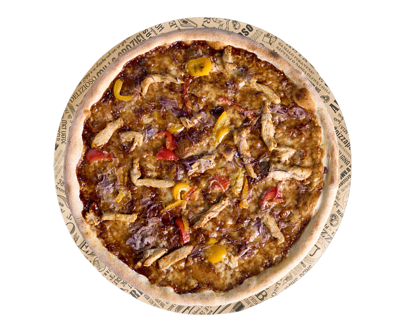 Barbecuesauce, Mozzarella, frittierte Hähnchenbruststreifen, Paprika, Zwiebeln