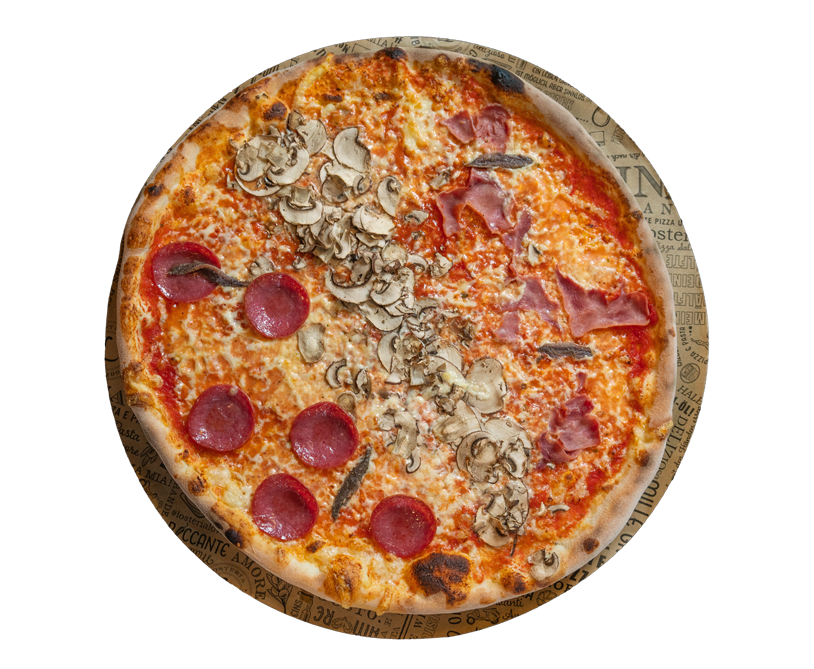 Käse, Hinterschinken, frische Champignons, Salami, Sardellen