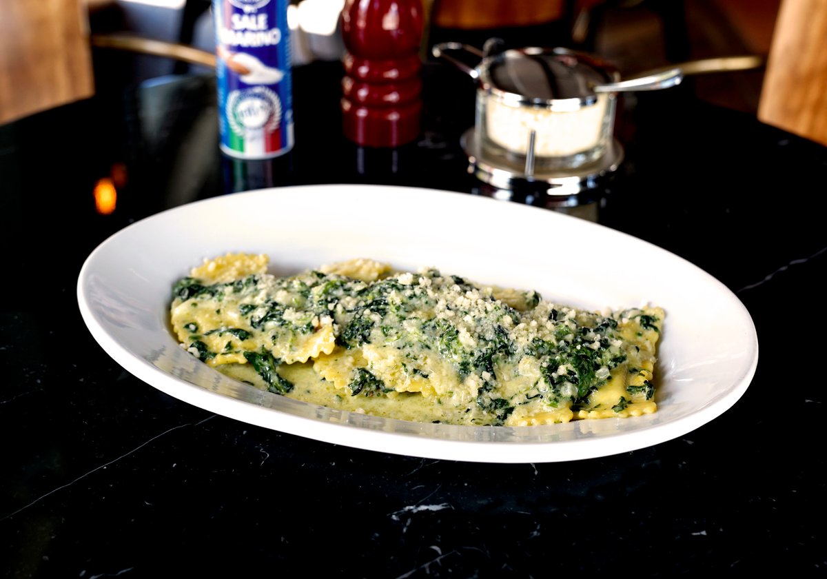 Spinat, Sahnesauce, Zwiebeln, Knoblauch, ital. Hartkäse