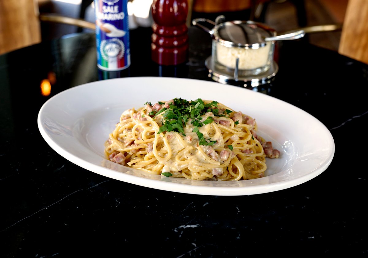 Speck, Sahnesauce, Eigelb, ital. Hartkäse, Petersilie