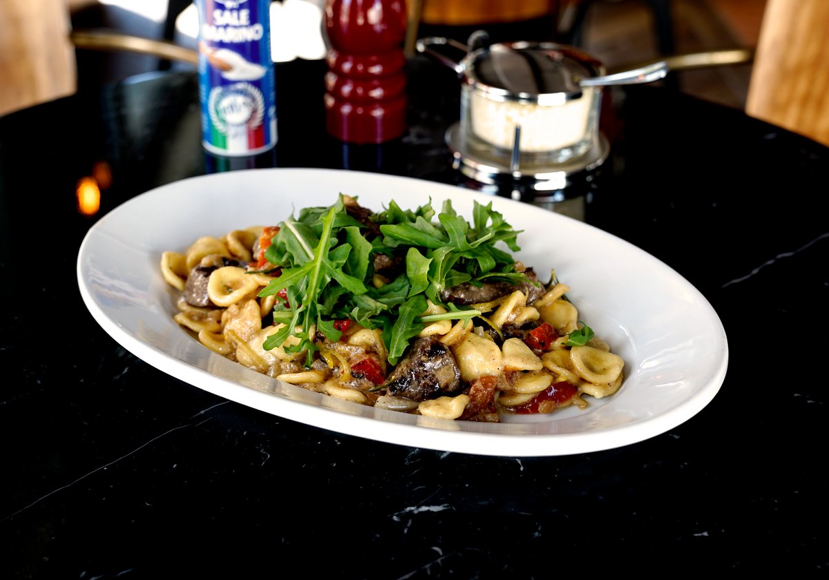 Rinderfiletstreifen, Paprika, Rucola, Zwiebeln, Knoblauch, Mascarpone-Zitronensauce, Rosmarin – piccante