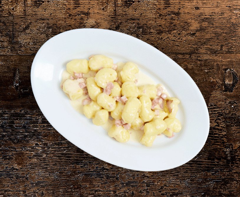 Hinterschinken, Sahnesauce, Zwiebeln, ital. Hartkäse