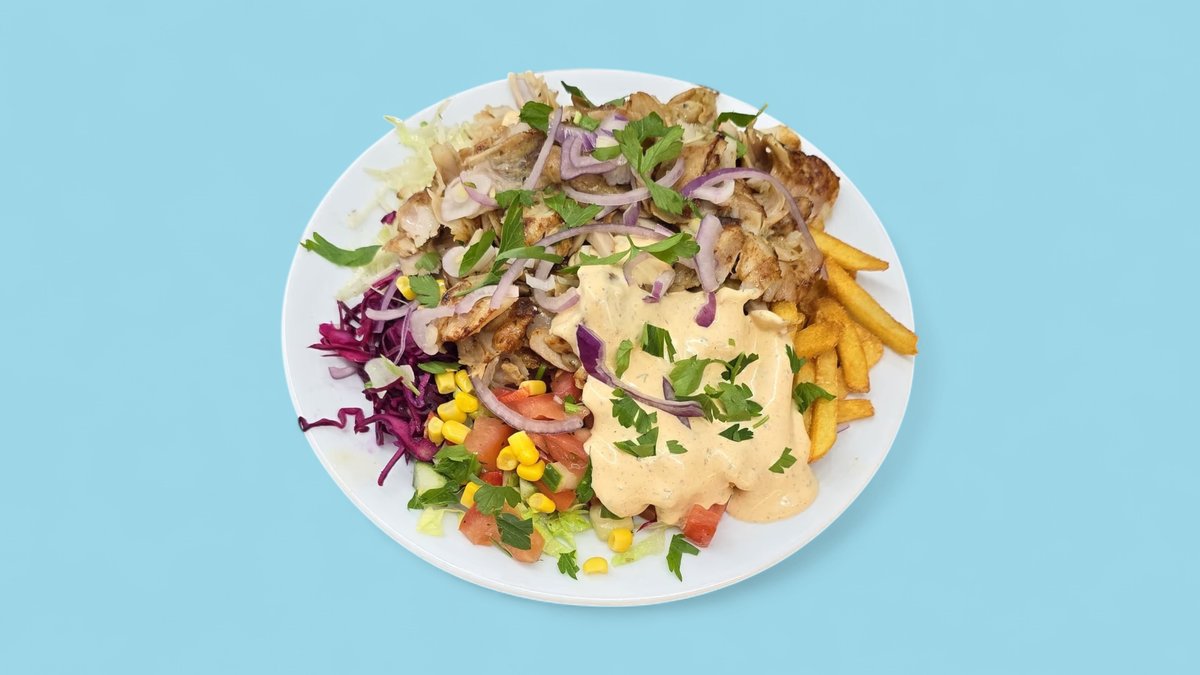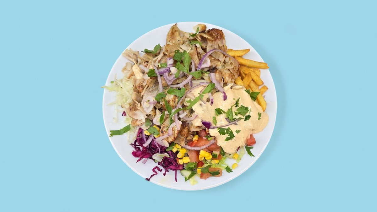mit Salat, Soße und einer Beilage deiner Wahl, serviert in einer Größe deiner Wahl