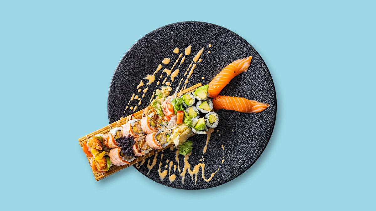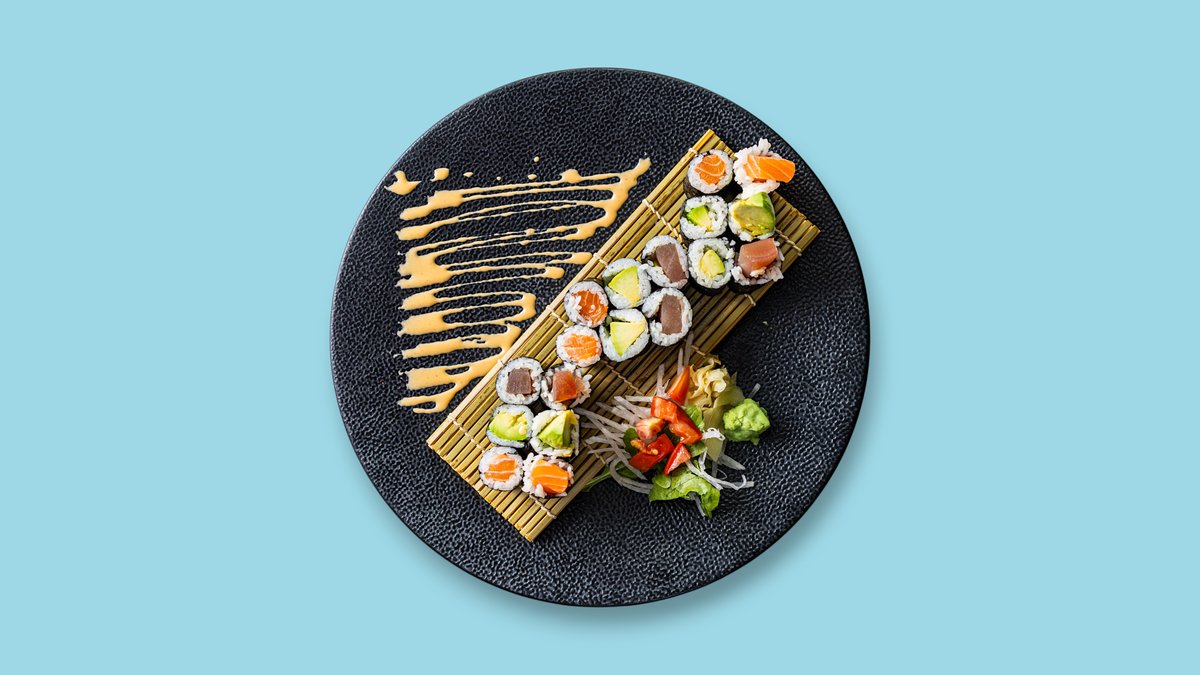 8x Tempura Lachs 8x Signature Uramaki des Tages 6x Gurken Maki 2x Lachs Nigiri 2x Garnelen Nigiri 2x Sashimi Seetang Salat Thunfischtatar