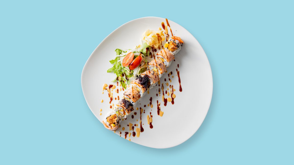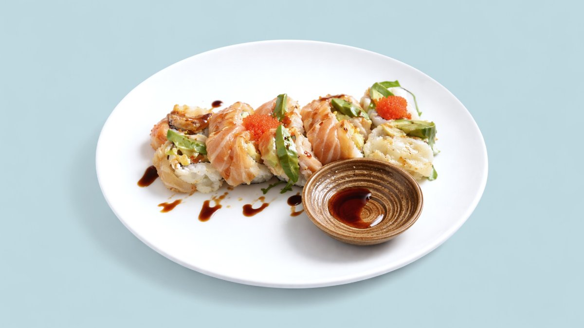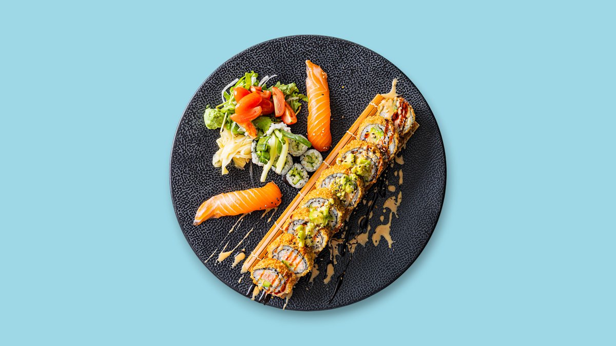 8x Uramaki: Tempura Garnele, Avocado, Mango, Philadelphia und oben flambierter Lachs 2x Lachs Nigiri 6x Avocado Maki