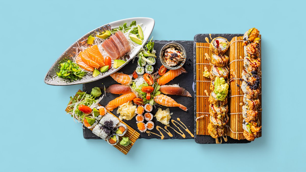 8x Tempura 8x Signature Uramaki des Tages 8x Uramaki: Lachs und Avocado 6x Gurken Maki 6x Lachs Maki 2x Lachs Nigiri 2x Thunfisch Nigiri 2x Garnelen Nigiri 6x Sashimi, Seetang Salat und Lachs-Tatar