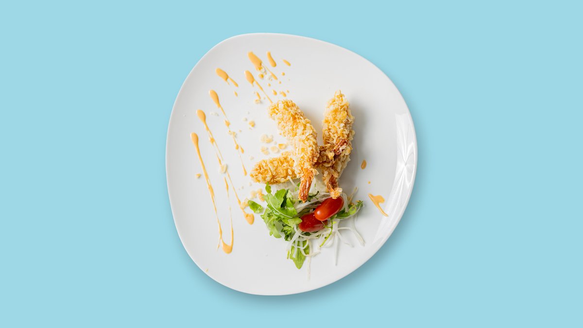 Panierte Black-Tiger-Garnelen in grünen Reisflocken