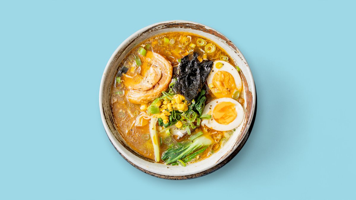 alle Gerichte werden mit Ramen Nudeln, Frühlingszwiebeln, Ei, Chashu (schweinefleisch), Pak Choi, Mais, Nori-Blätter, Morcheln, einer Zutat und Brühebasis deiner Wahl zubereitet