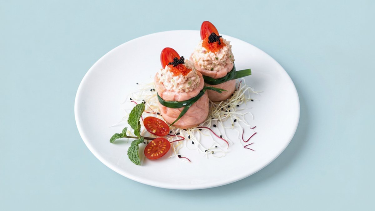 2x flambierter Lachs, gehackte Garnelen, Tobiko und Kirschtomaten