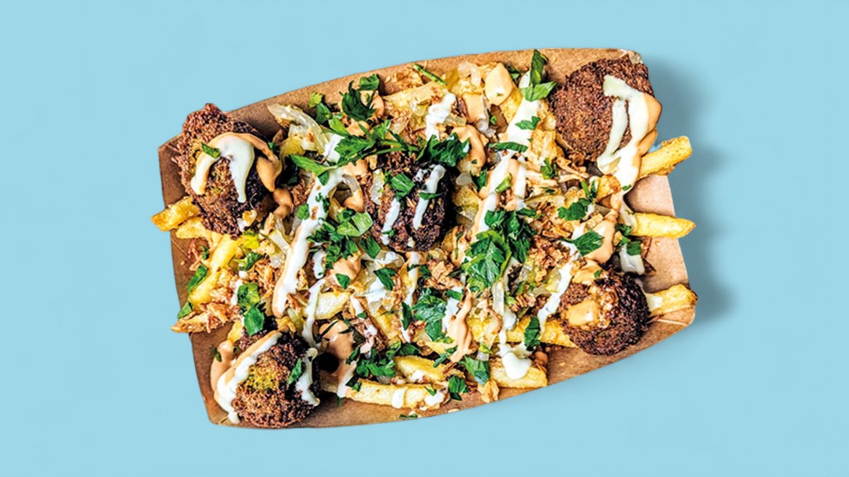Original Pommes, Falafelbällchen, Röstzwiebeln, Gewürzgurken, frische Petersilie und Homemade Burger Sauce sowie Sweet-Mustard finish