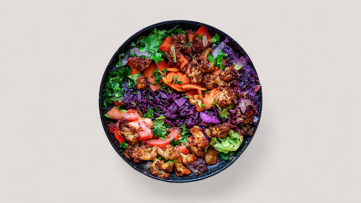 Mit Falafel, Gegrillten Auberginen, Cumin-Blumenkohl, Karotten, grĂĽnem Salat, Hummus (wahlweise inklusive mit Joghurt- oder Sojajoghurt finish)