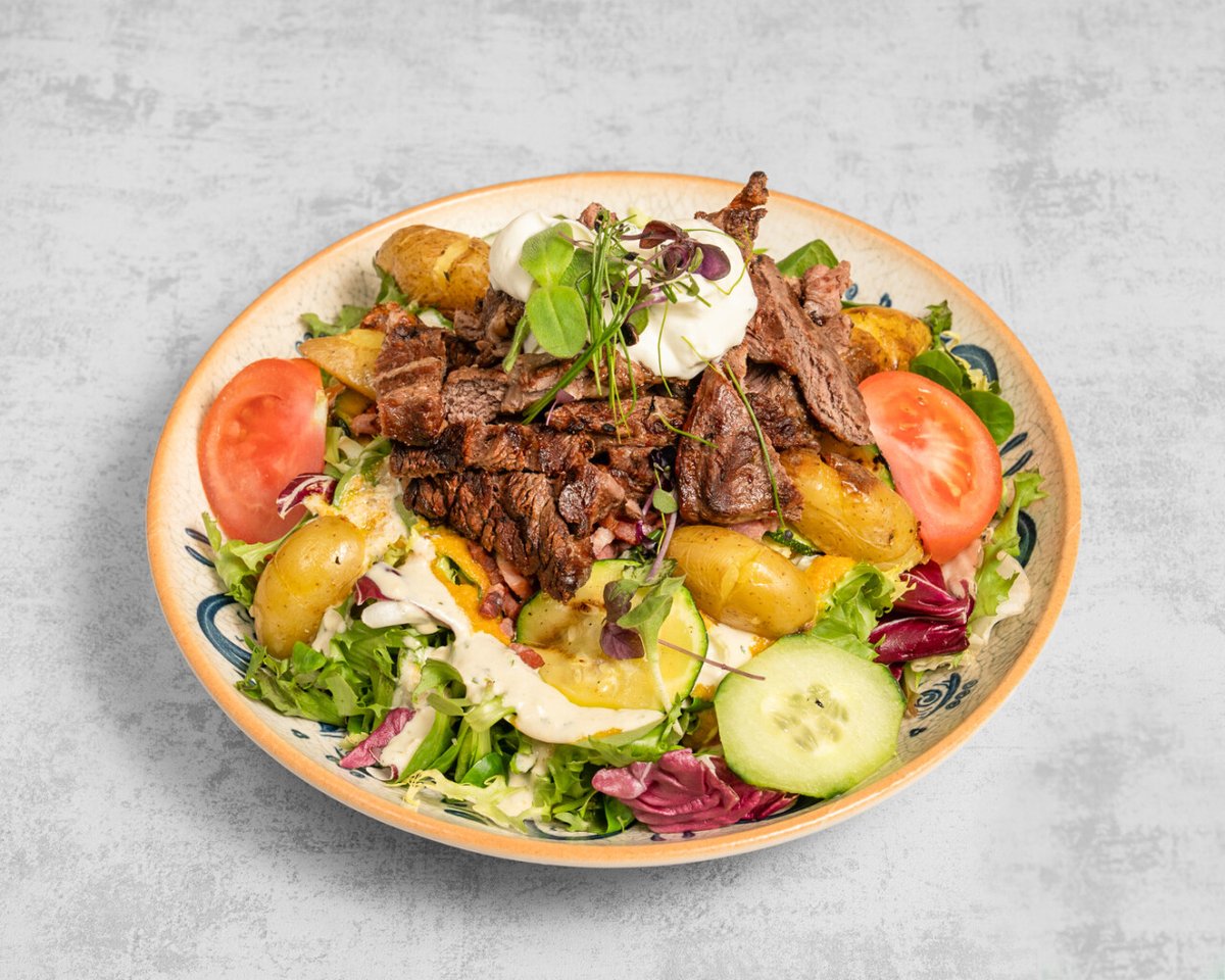 Salade verte, tomates fraîches, concombre, tranches d’entrecôte d’argentine au grill, pommes de terre sautées, courgettes grillées, lardons, fromage blanc aux fines herbes, vinaigrettes faites maison, décoration du Chef.