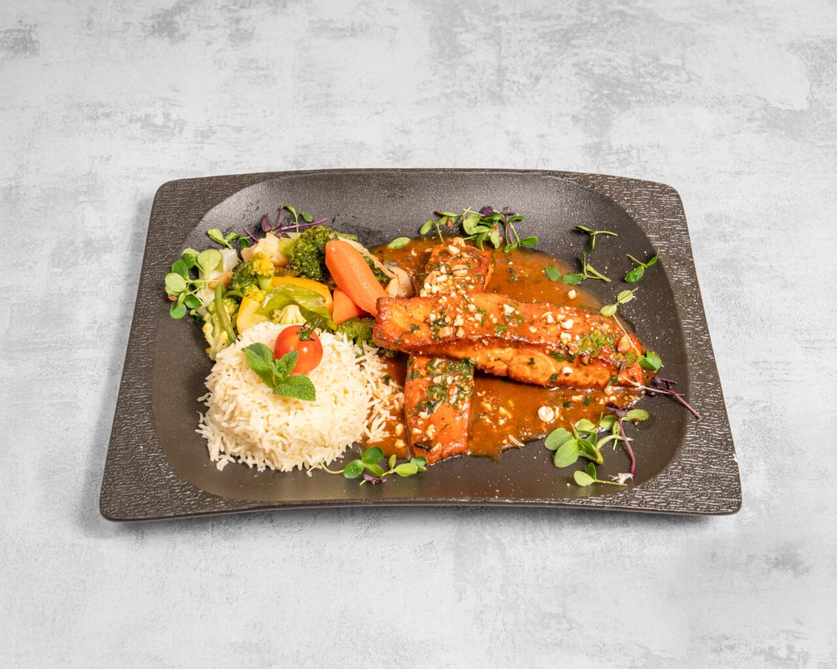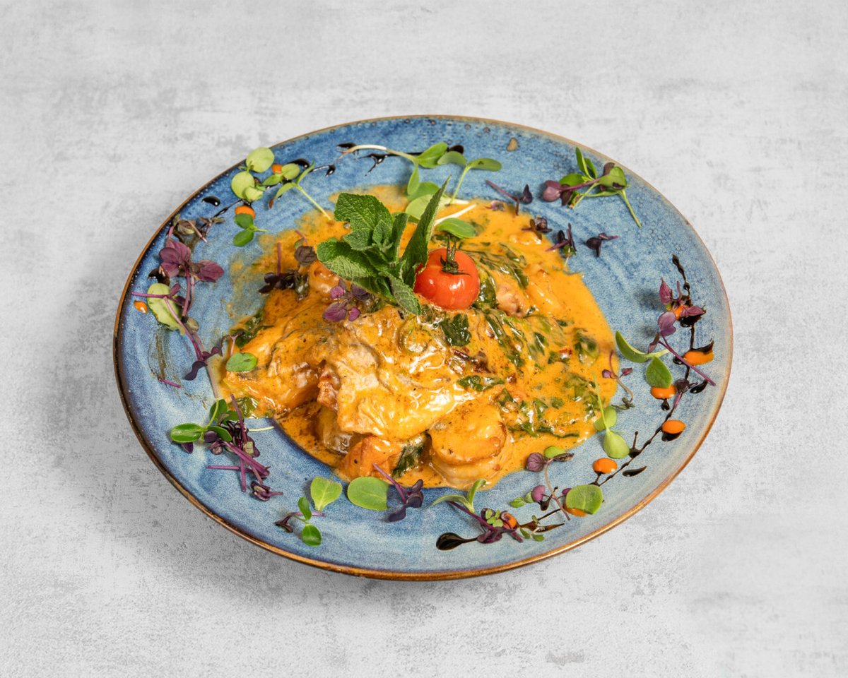 Filet de saumon et dorade, scampi, le tout dans une sauce crème à l’ail, poivrons et épinards frais, pommes de terre, légumes.