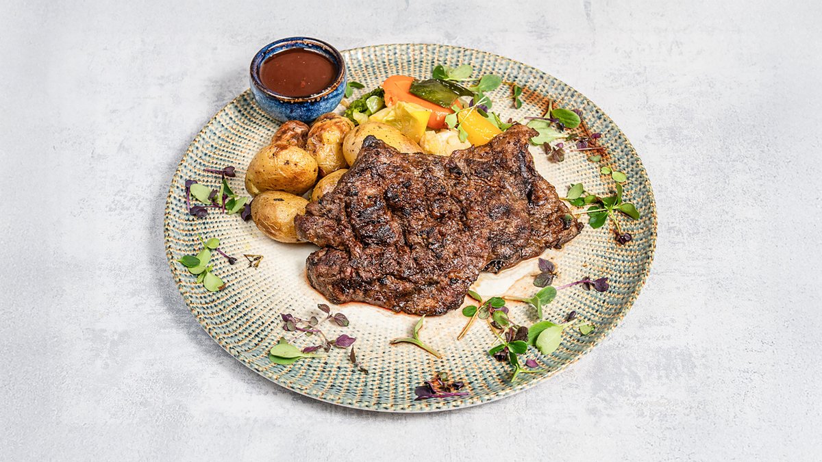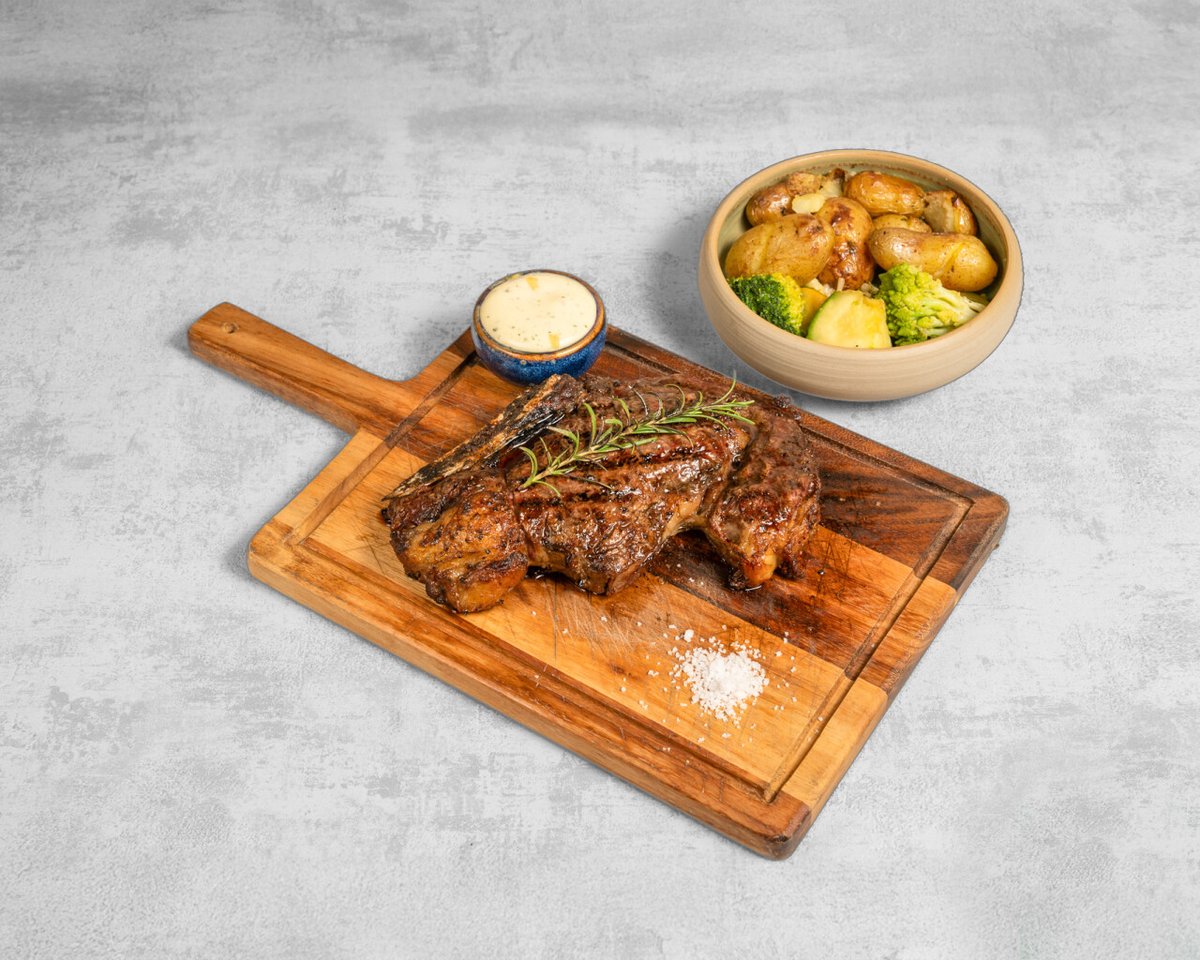 Côte à l'os de bœuf angus, pommes de terre, légumes, mayonnaise romatisée aux herbes.