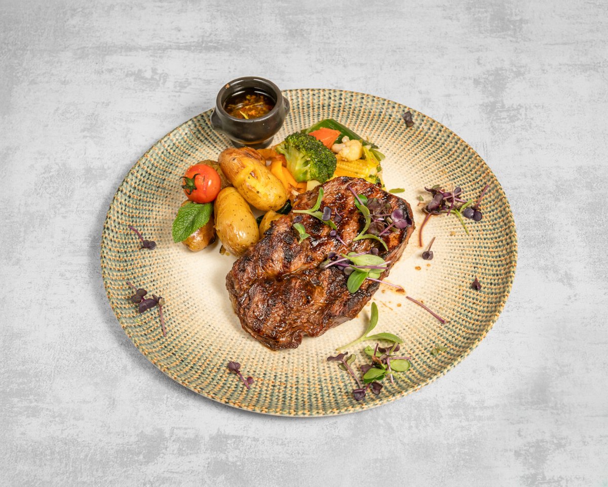 Pièce d'entrecôte argentine, sauce chimichurri, pommes de terre, légumes.