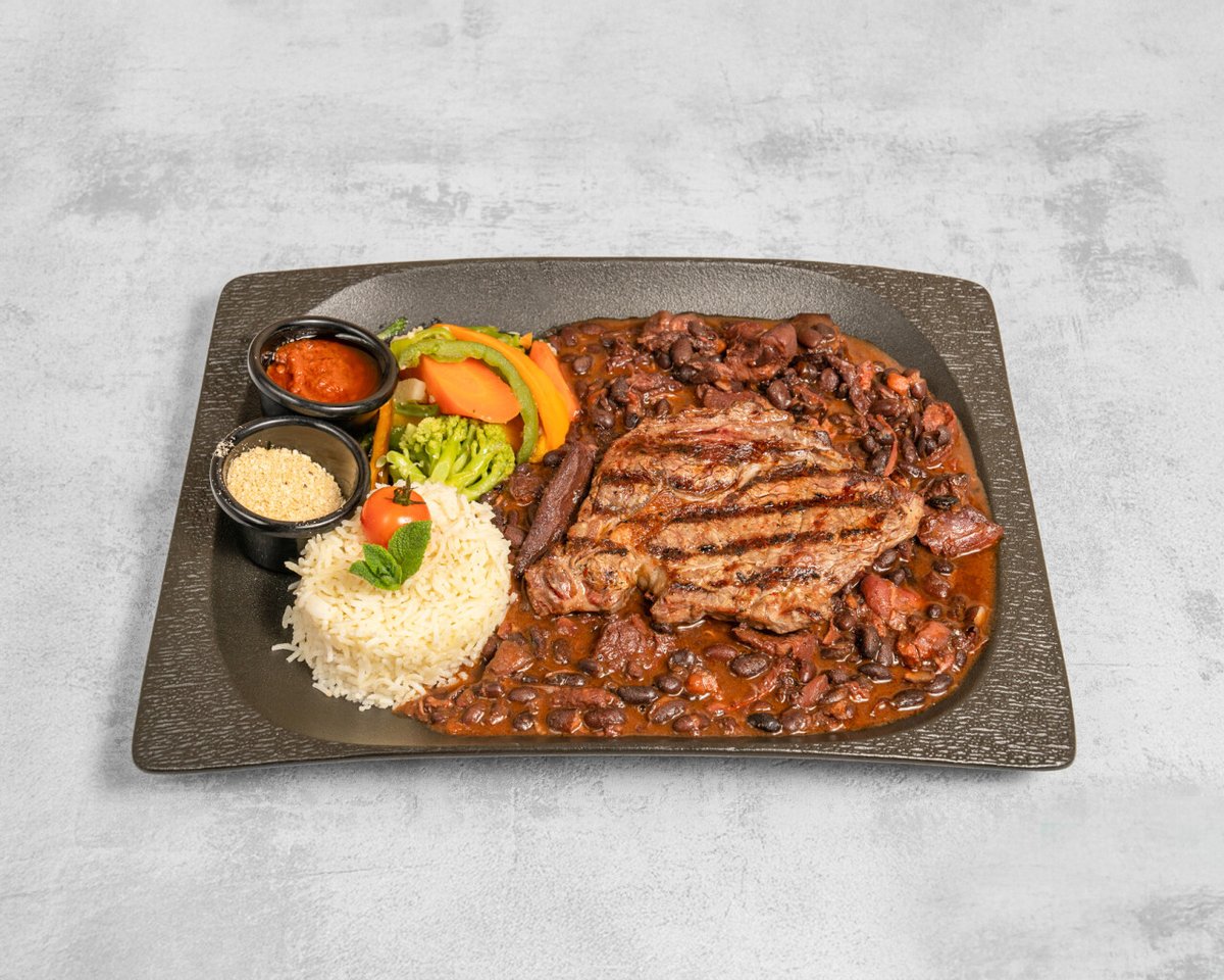 Noix d’entrecôte d’Argentine, viande de porc, chorizo, jambonneau, haricots noirs, légumes, riz et farofa, sauce épicée.