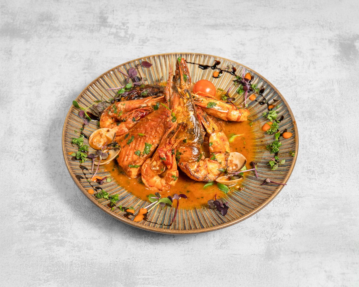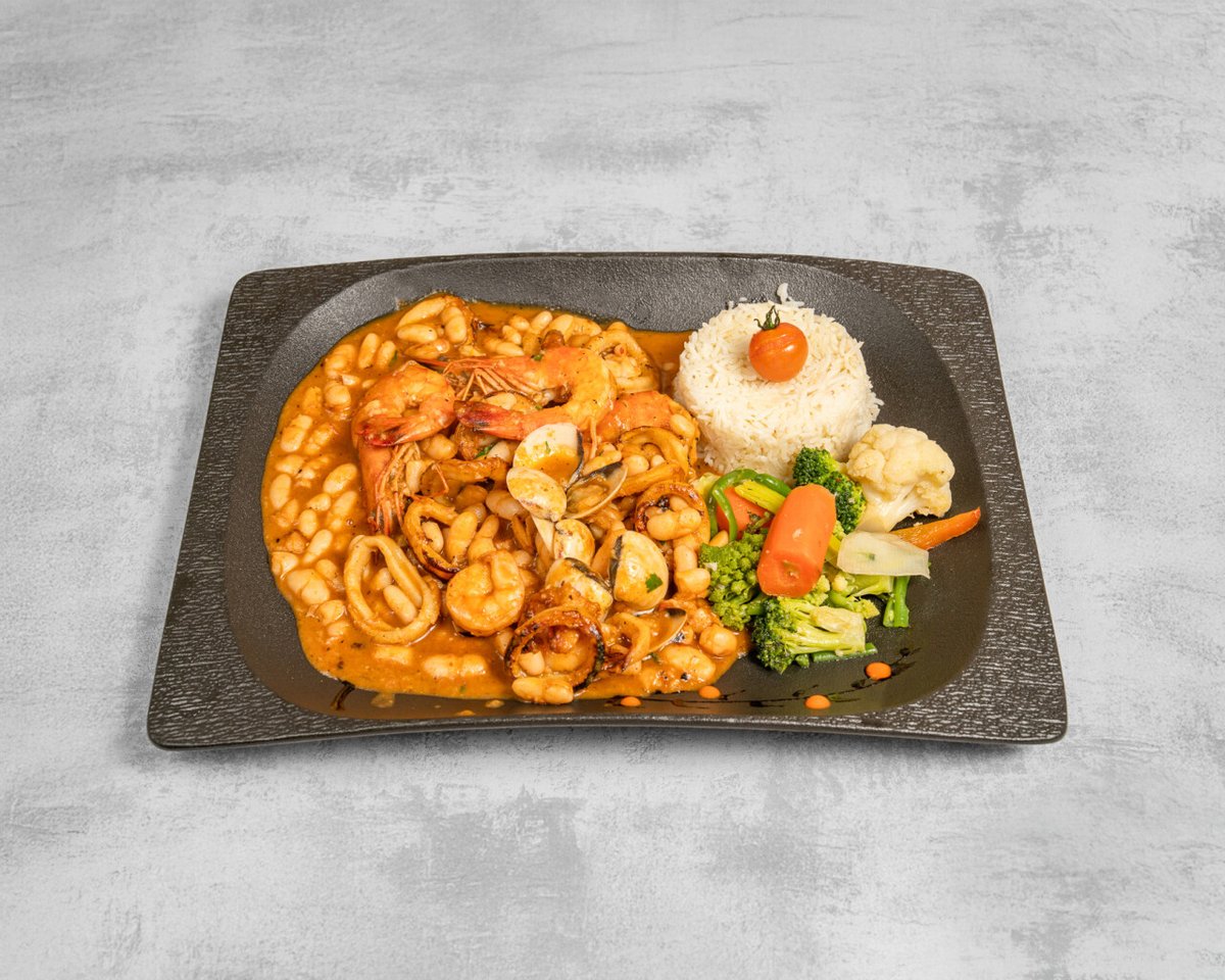 Gambas, scampis, calamars et palourdes, légumes, haricots blancs en sauce au vin du Brésil et fond de crustacés, riz, farofa, sauce épicée.