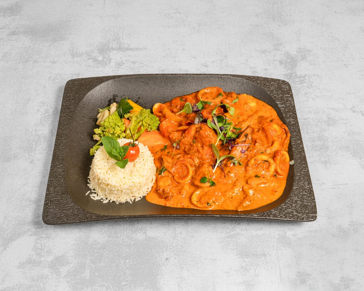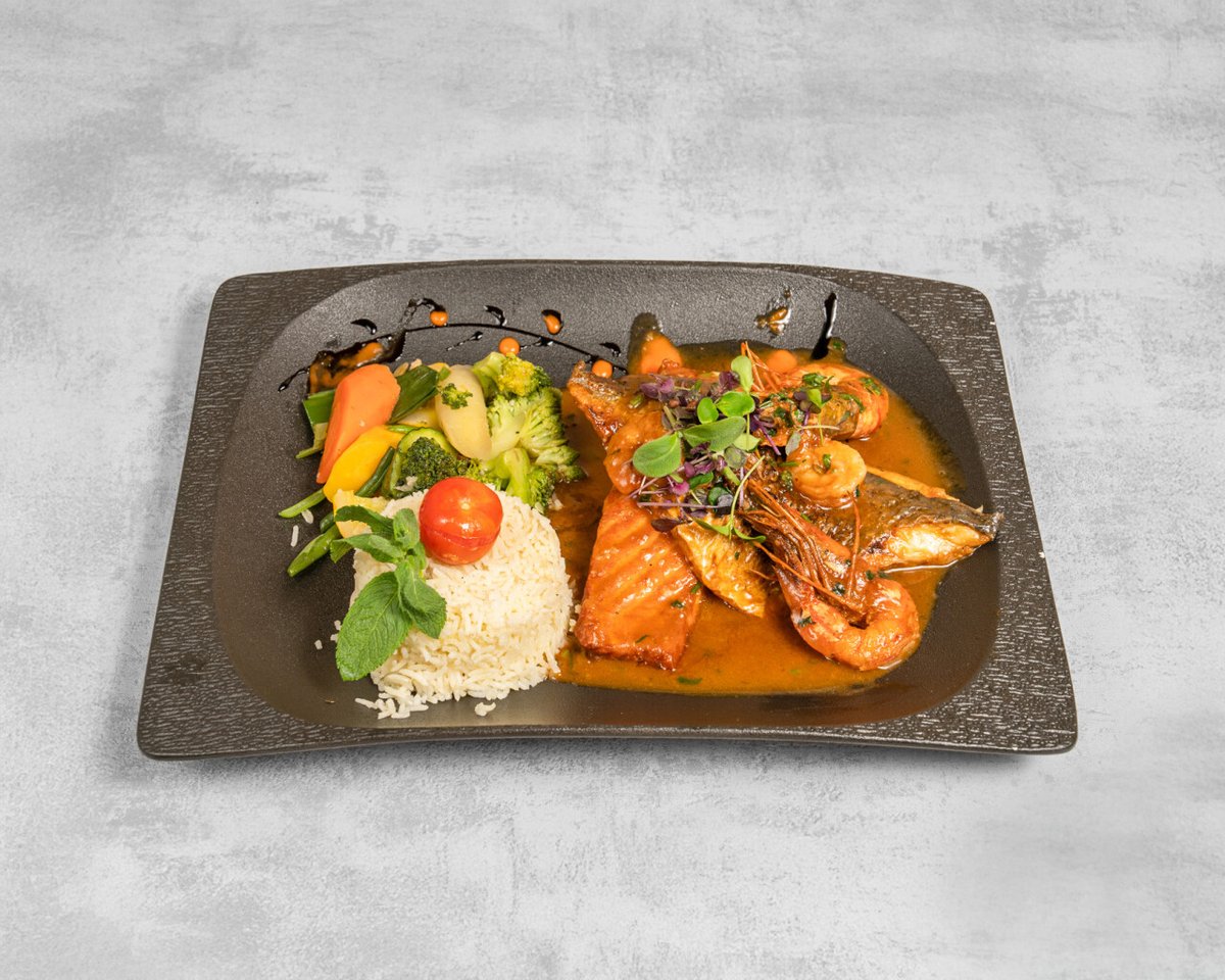 Des gambas et scampis, calamars, pulpe et palourdes, sauce à base de lait de coco, tomate et poivrons rouges, riz, légumes.