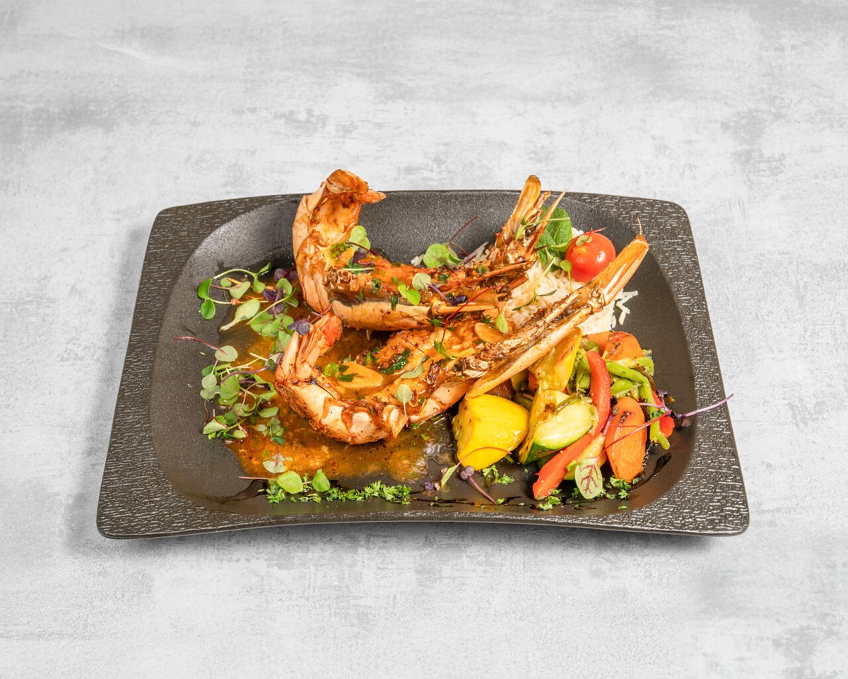 Filet de saumon, scampis géants, octopus et gambas, le tout à la plancha, sauce beurre à l’ail et coriandre frais, pommes de terre, bouquet de salade verte aux vinaigrettes maison.