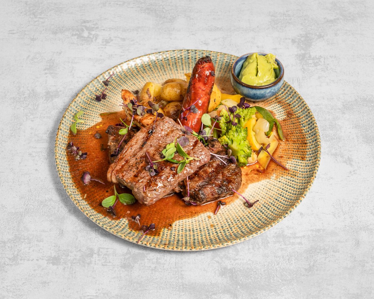 Noix d’entrecôte et filet de bœuf d’Argentine, picanha au grill, poulet, chorizo, sauces au Porto et guacamole, pommes de terre, légumes.