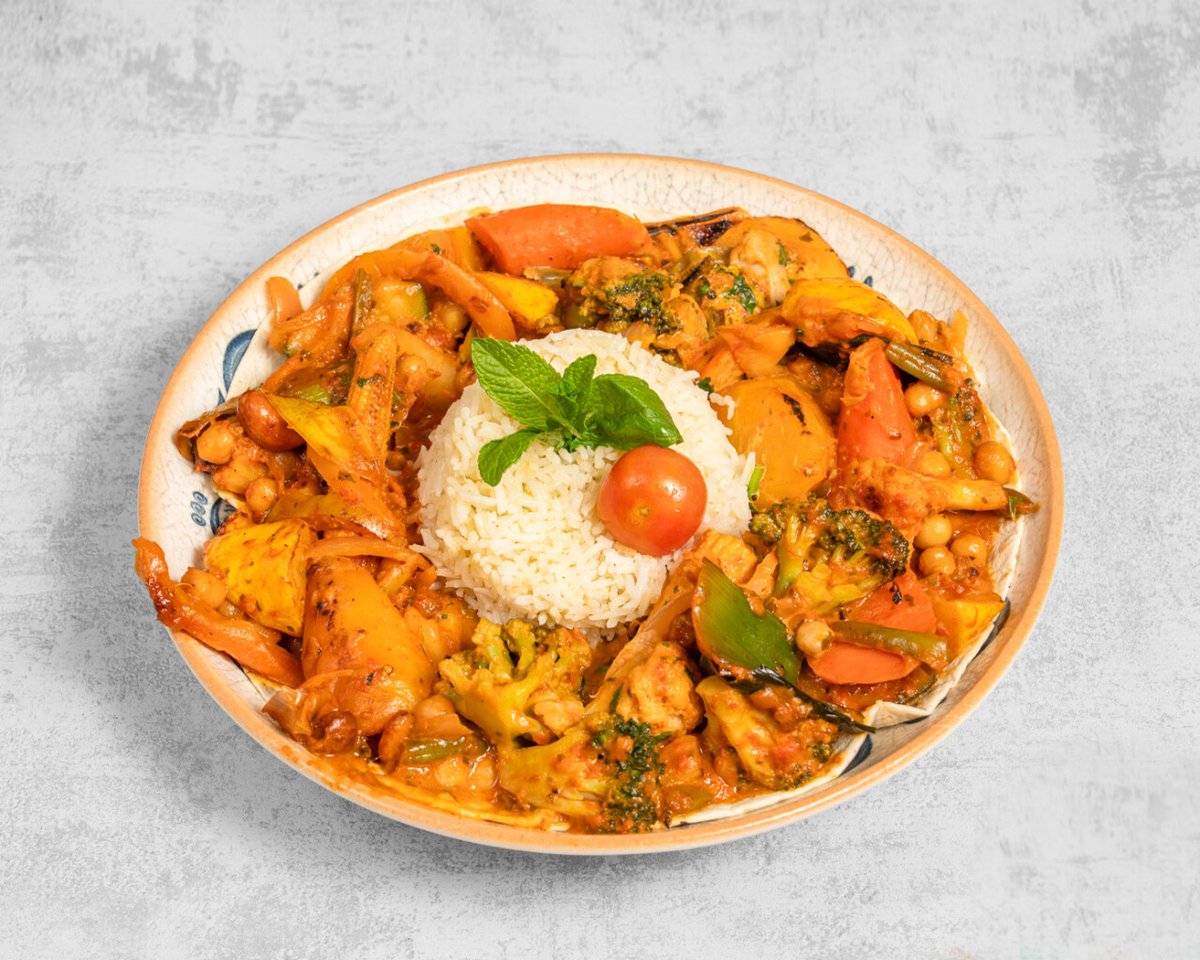 Légumes cuits à la vapeur, sauce à base de lait de coco, tomate et poivrons rouges, riz, noix de cajou.