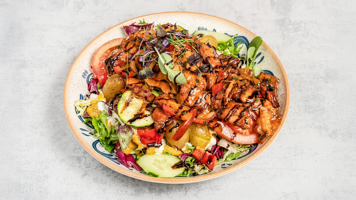 Salade verte, tomates fraîches, concombre, poulpe à la plancha, poivrons, olives noires, courgettes grillées, pommes de terre sautées, vinaigrettes faites maison, décoration du Chef.