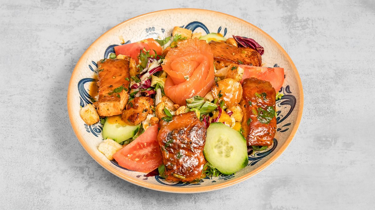 Salade verte, tomates fraîches, concombre, filet de saumon grillé, saumon fumé, scampis à l’ail, croûtons au beurre, noix du brésil, vinaigrettes faites maison, décoration du Chef.