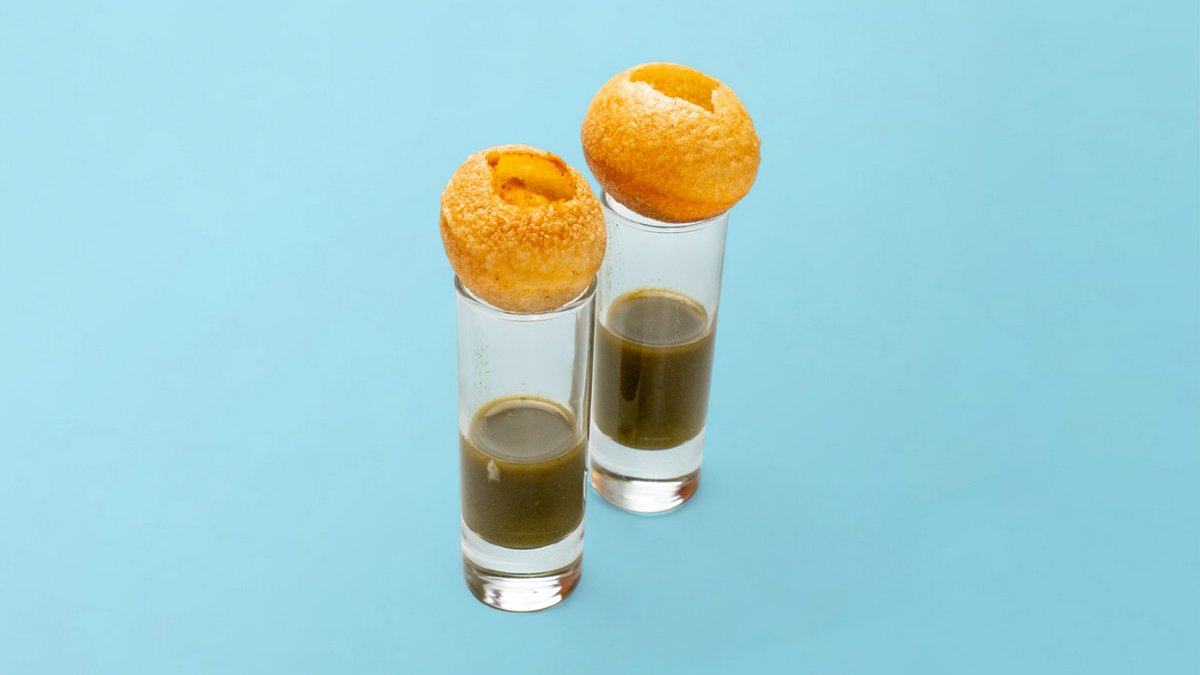 Crisp hollow puris filled with spicy tangy tamarind water, potato, and chickpeas-that perfect burst of chatpata joy with every bite.