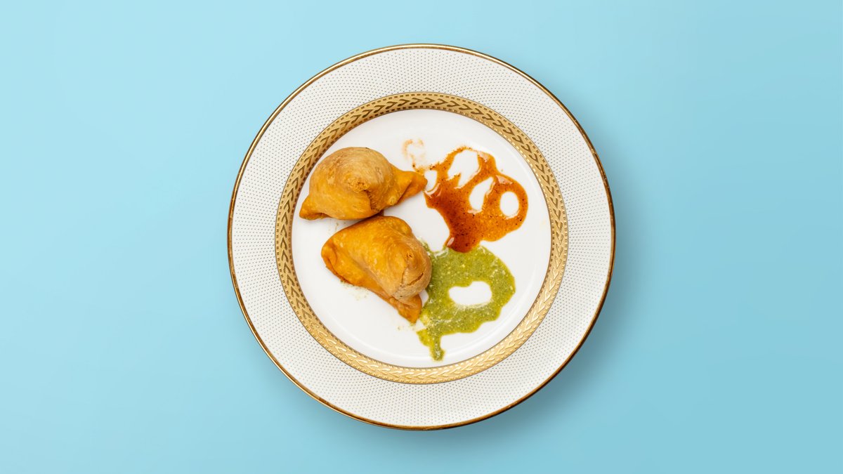 Crushed samosas drenched in tangy tamarind and mint chutneys, topped with yogurt, sev, and fresh coriander-street food royalty.