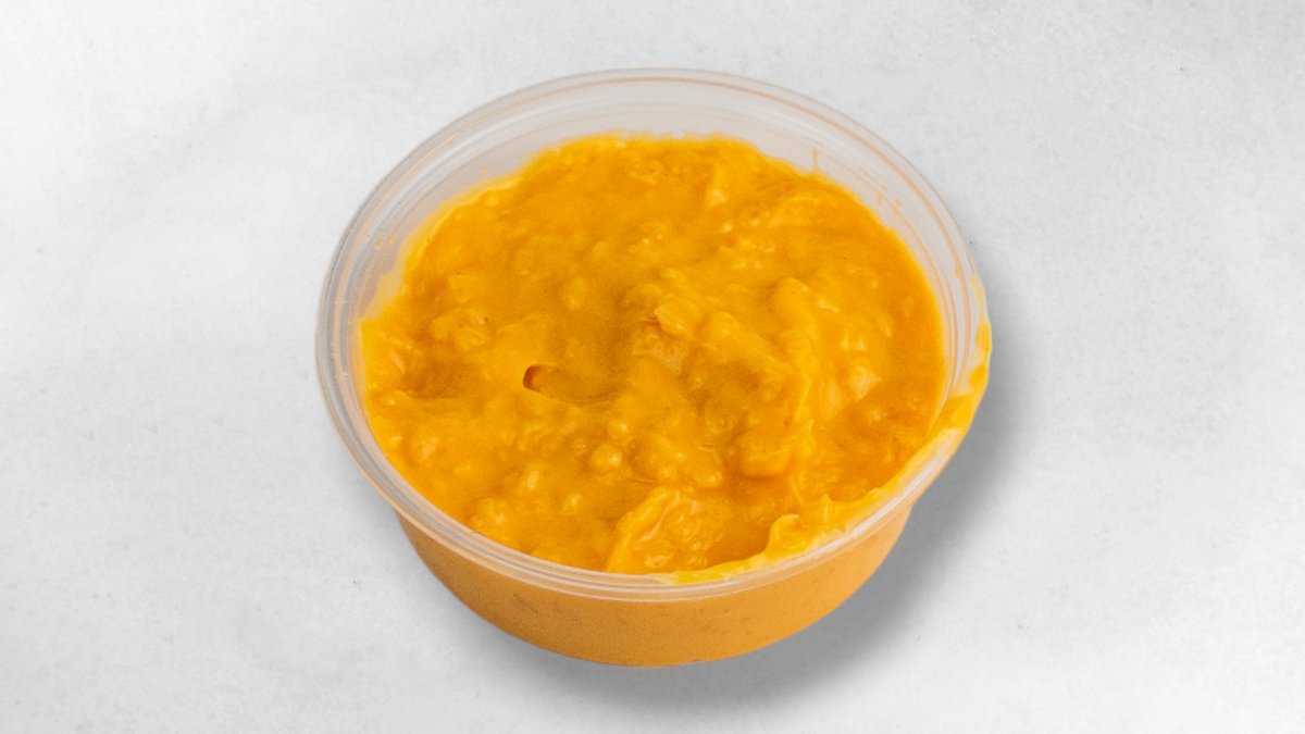 Filets de poulet, oeuf, fécule de pomme de terre, panko, pain tortilla, sauce au fromage, frites. Sauce, légumes et boisson au choix