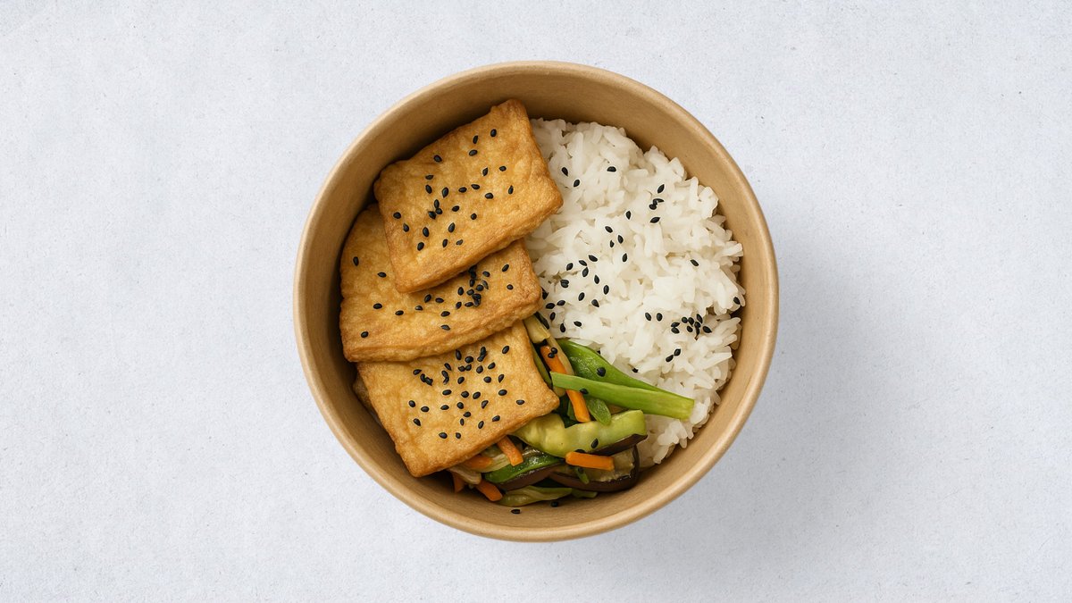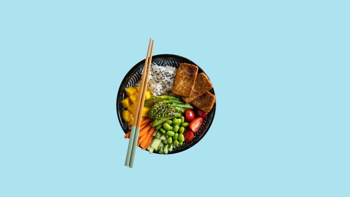 Riz, 1/2 avocat, Carottes, Tofu Doux, Edamame, mangue, Edamame, tomates cerises, Concombre, graines de sésame