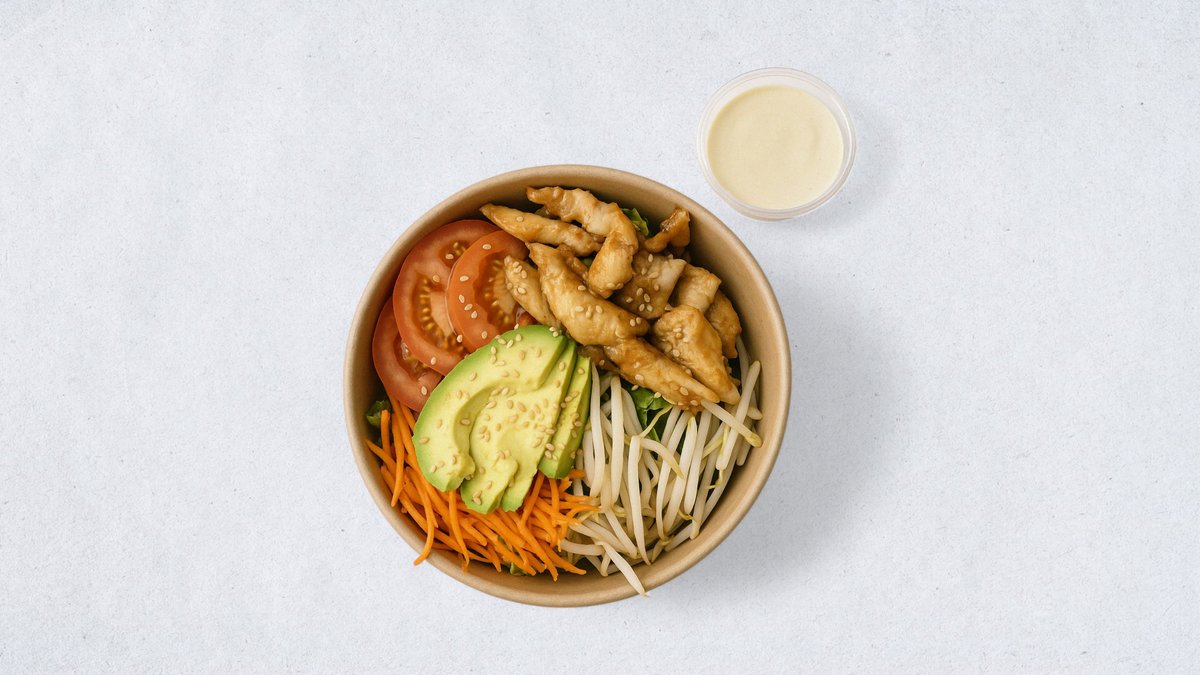 Pùtes ou salade verte, poulet, pousses de soja, carottes, tomates, avocat, sauce sésame