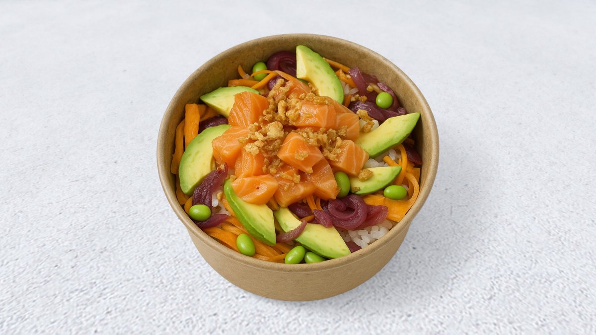 Riz, 1/2 Avocat, Carottes, Oignon croustillant, Edamame, Oignons rouges, Saumon