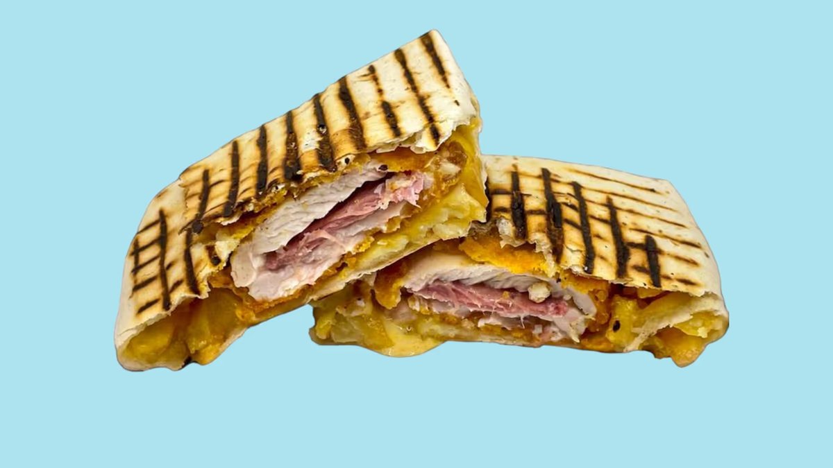 Cordon bleu, pain tortilla, sauce au fromage, frites. Sauce, légumes et boisson au choix