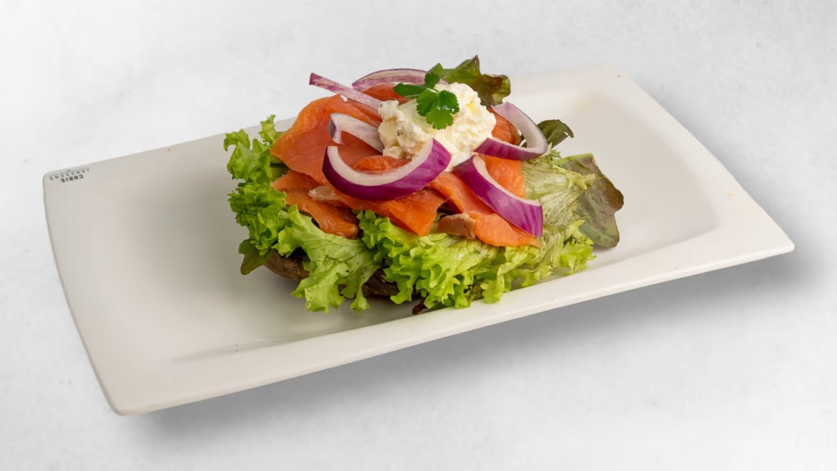 Pomme de terre au four, saumon fumé, salade, creme, ciboulette, oignons rouges, aneth