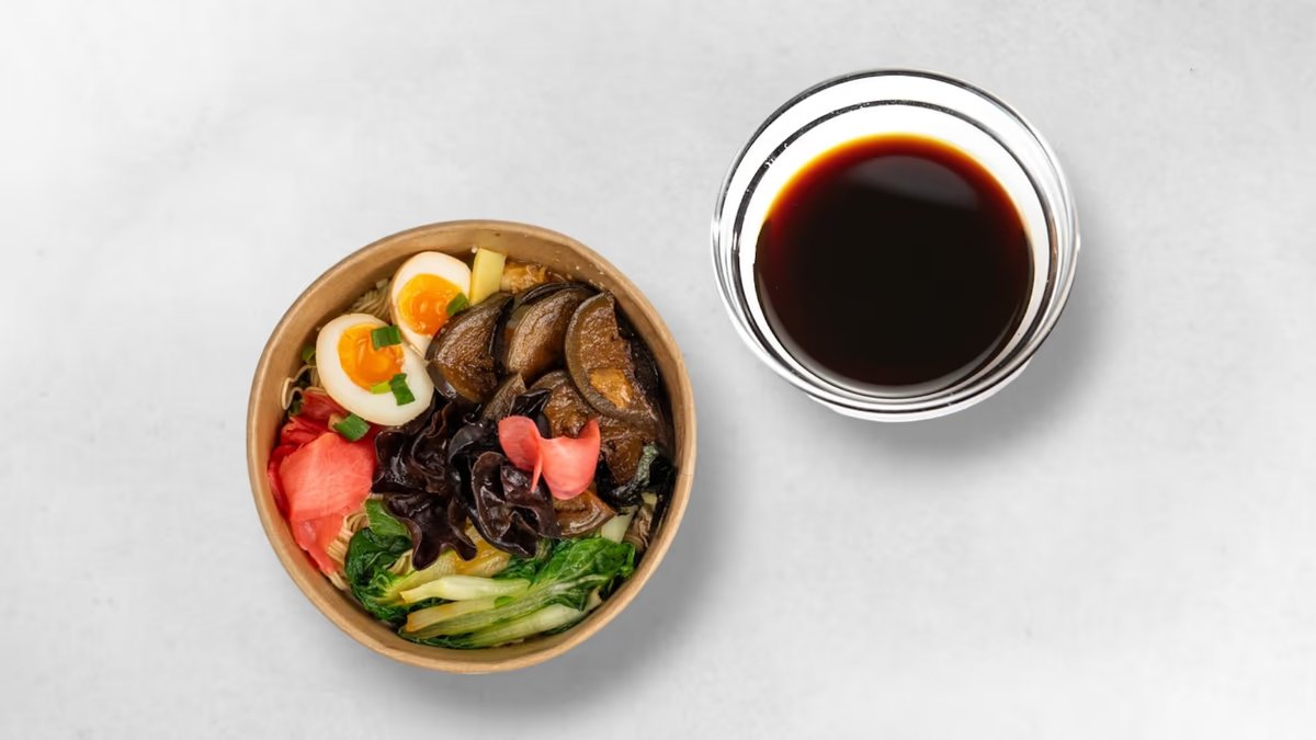 Sauce soja shoyu bouillon de soupe (rĂ©chauffer au micro-ondes pour une tempĂ©rature optimale) nouilles de tokyo (130 gr, (lĂ©gĂšrement frisĂ©es, moyennement larges) pak choi Ćuf mollet menma oignons nouveaux champignons noirs gingembre algues nori