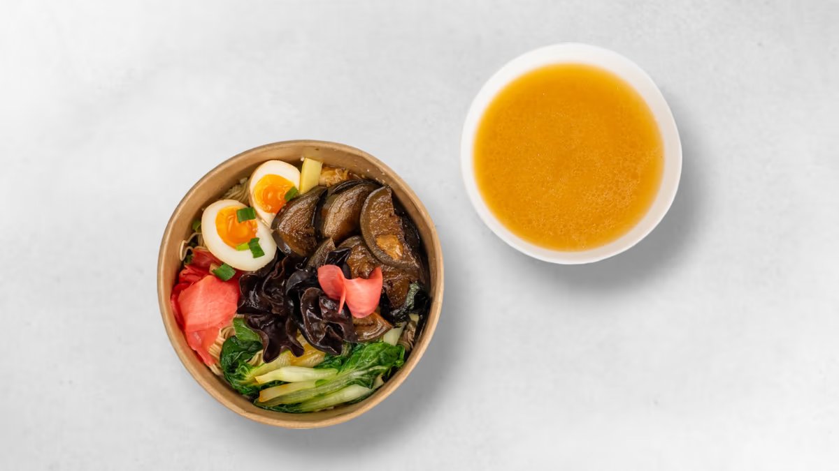 Bouillon de soupe miso Ă rĂ©chauffer au micro-ondes pour une tempĂ©rature optimale) nouilles sapporo (130 gr, (nouilles Ă©paisses et robustes) pak choi Ćuf Ă la coque menma oignons nouveaux champignons noirs gingembre algues nori